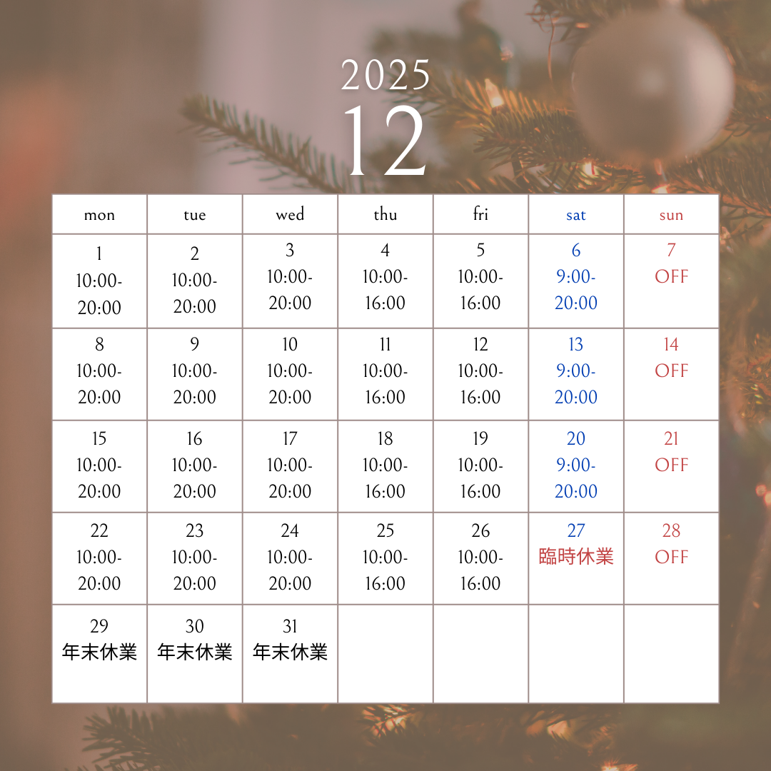 リコンディショニングコース 月・火・水 10時〜20時(最終受付19時) 木・金 10時~16時(最終受付15時) 土 9時〜20時(最終受付19時) 日・祝日 休業 |