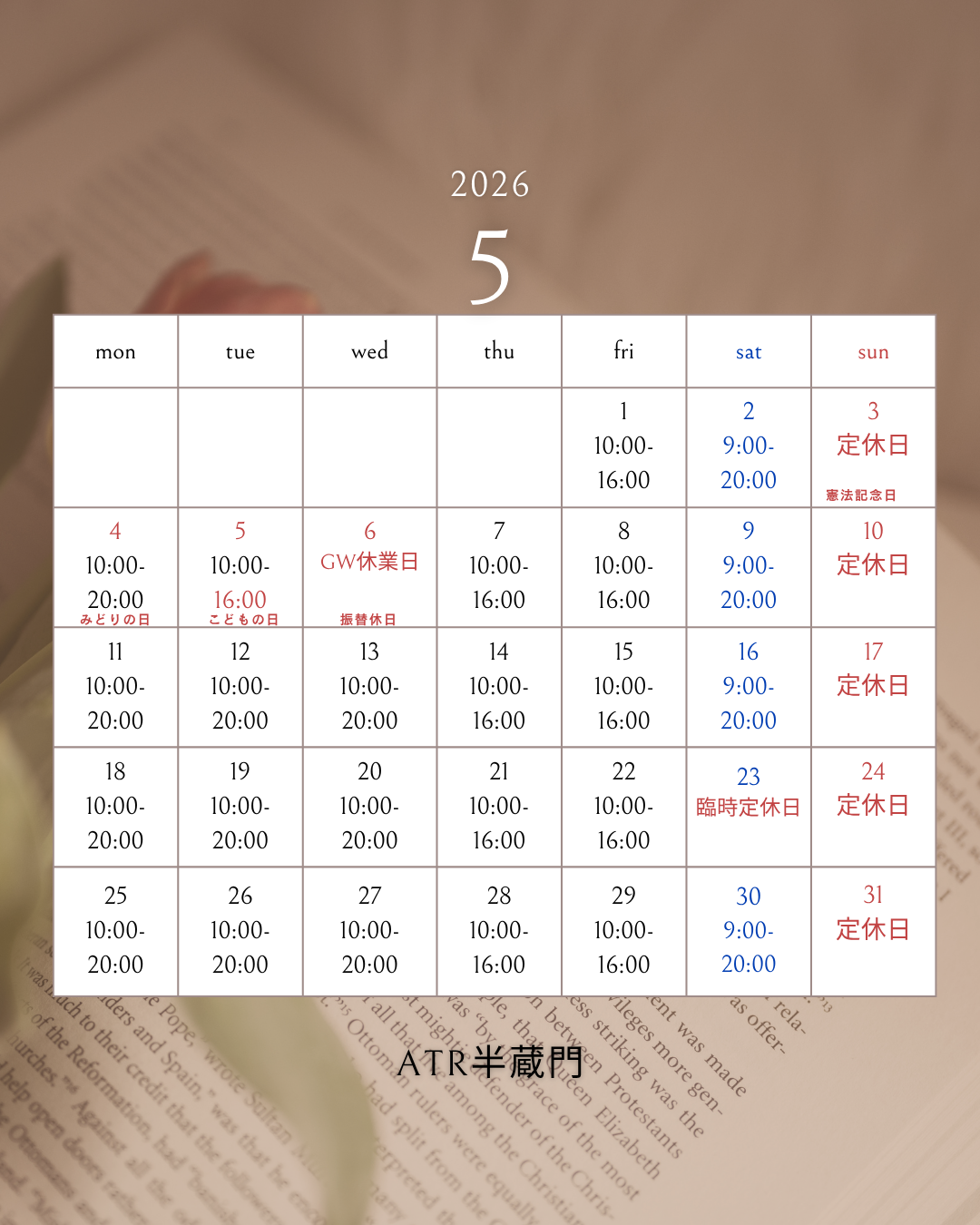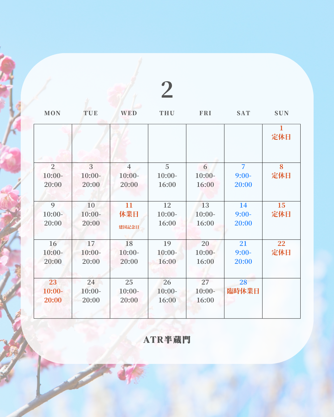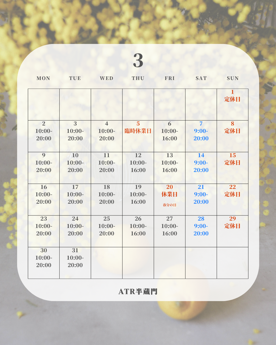 営業時間:月・火・水 10時~19時 / 木・金 10時~15時 / 土 9時~19時