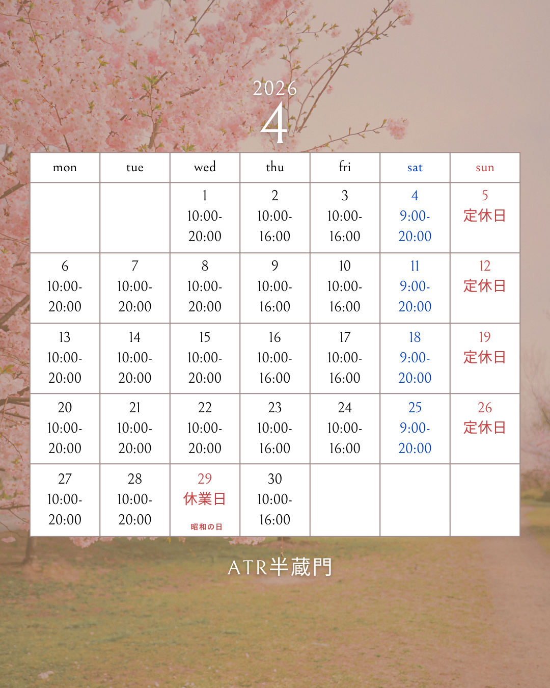 営業時間:月・火・水 10時~19時 / 木・金 10時~15時 / 土 9時~19時